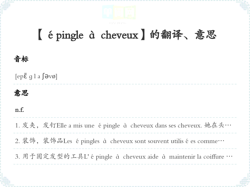 【épingle à cheveux】 助记:、 词根:、 联想、 名词化:、 词化:、 形容词化:、 近义词、 反义词、 同音、近音词 联想词