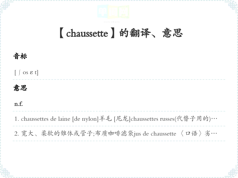 宽大、柔软的锥体或管子;布质咖啡滤袋jus de chaussette 〈口语〉劣质咖啡chaussette d'évacuation(火灾时)人员撤退通道