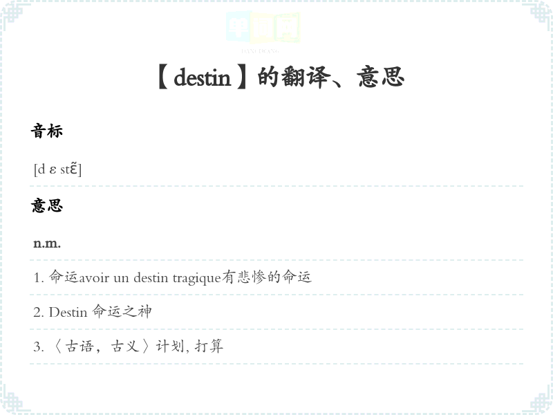1.destinée n.f. 命运,天命;遭遇