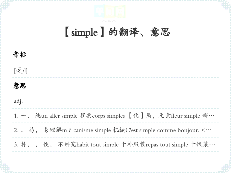 纯朴, 朴实, 爽直, 纯; 谦虚simple comme un enfant 像小孩一样纯Il a su rester simple malgré ses nouvelles fonctions. 他虽然担任了新职,但仍保持谦虚。