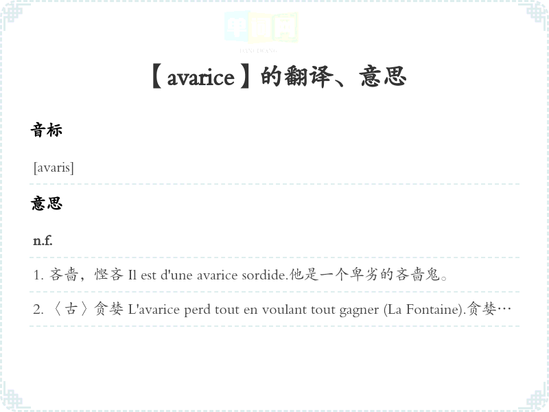 〈古〉贪婪 L'avarice perd tout en voulant tout gagner (La Fontaine).贪婪使人想得到一切而结果却使人丧失一切。(拉封丹)