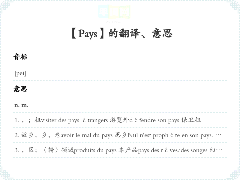 【Pays】 派生:、 近义词:、 反义词: 联想词