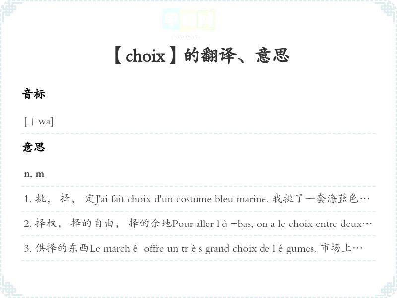 【choix】 联想、 动词变化:、 形容词变化:、 近义词、 反义词、 同音、近音词 联想词