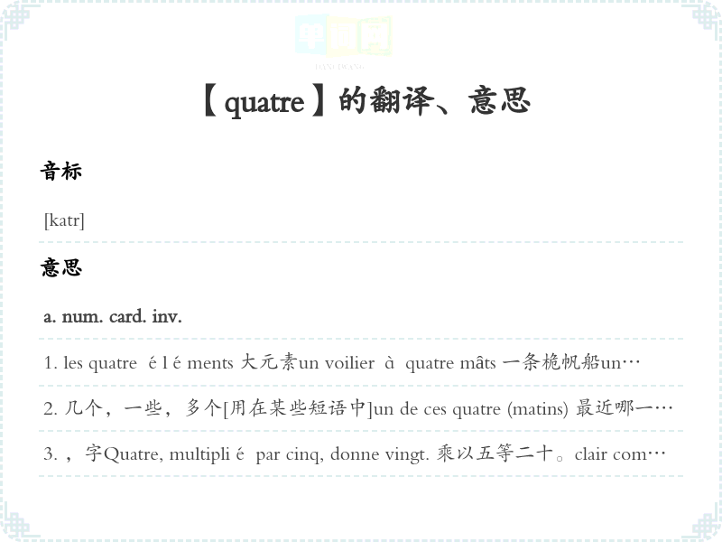 几个,一些,多个[用在某些短语中]un de ces quatre (matins) 最近哪一天,改天à quatre pas d'ici 离这儿只有几步路,就在附近ne pas aller par quatre chemins 直截了当,不转弯抹角dire ses quatre vérités 毫不客气地直率地讲;<引>责备,责骂se tenir à quatre 竭力克制自己,竭力忍住comme quatre 像个人一样多,很多引>a. num. ord. inv.第page quatre 第页Henri IV 世Il est quatre heures 现在是4点钟。mon quatre heures <儿语>我下午一顿点心。儿语>n. m. inv.