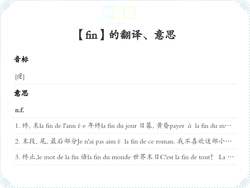 终, 末la fin de l'année 年终la fin du jour 日暮, 黄昏payer à la fin du mois 月底付款[省略用法]traite à payer fin septembre [courant] 九月底 [本月底] 付款的汇票arriver à la fin d'un livre 看完本书tirer [toucher] à sa fin 即耗尽;快要en fin de compte 终究, 究竟, 归根底, 总之