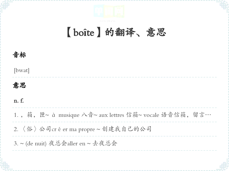 【boîte】 联想、 近义词、 同音、近音词 联想词