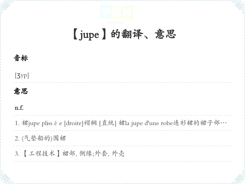 【jupe】 联:、 名词变化:、 近义词: 联词