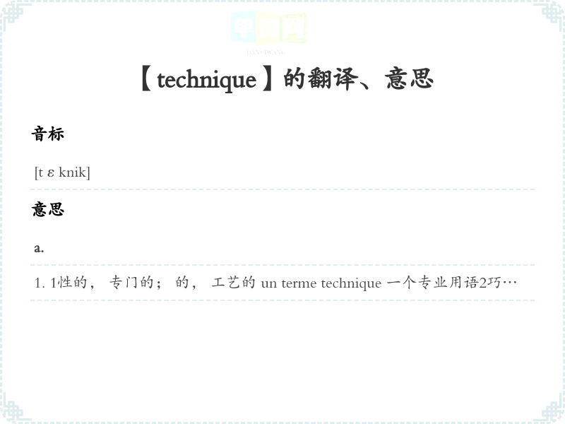 【technique】 助记:、 词根:、 派生:、 近义词: 联想词