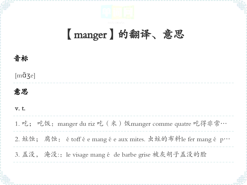 【manger】 联想:、 名词变化:、 近义词:、 反义词: 联想词