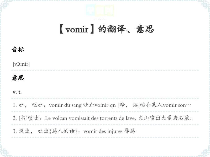 吐, 呕吐:vomir du sang 吐血vomir qn [转, 俗]唾弃某人vomir son déjeuner 把吃的早饭呕掉avoir envie de vomir 想吐, 恶心Cela donne envie de vomir. C'est à vomir. 真令人作呕。