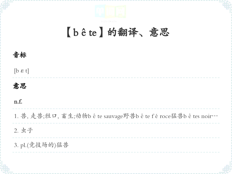 兽, 走兽;牲口, 畜生;动物bête sauvage野兽bête féroce猛兽bêtes noires黑色兽 [如野猪等]bête de somme驮重的牲口bête de trait拉车的牲口bête à(bon) Dieu瓢虫nos amis les bêtes动物, 我们的朋友être malade comme une bête 病得很痛苦regarder qn comme une bête curieuse不礼貌地盯着某人看chercher la petite bête 极端细致;吹毛求疵C'est sa bête noire.这是他最厌恶的人或事物。这是他的眼中钉。Morte la bête , mort le venin.〈谚语〉祸根拔掉, 祸害消除。remonter sur sa bête 东山再起, 失而复得reprendre du poil de la bête 重新振作起来, 重占优势