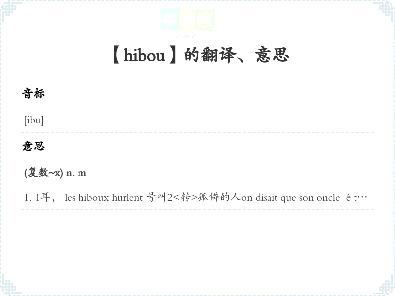 1耳, les hiboux hurlent 号叫2<转>孤僻的人on disait que son oncle était un vieux hibou 人家说他的叔父是一个孤僻的老转>
