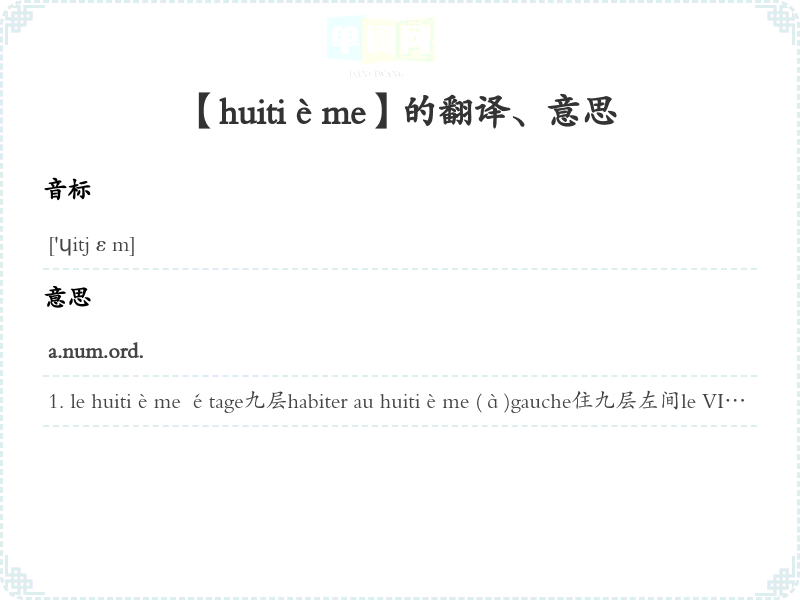 le huitième étage九层habiter au huitième (à)gauche住九层左间le VIIIe arrondissement de Paris巴黎区habiter dans le VIIIe [8e]住在区— n.个, 名arriver le huitième dans une compétition比中得名— a.分之的la huitième partie分之— n.m.分之trois huitièmes分之三huitième (s) de finale【体育】半, 分之 [争夺进入前名的比]— n.f.〈旧语,旧义〉年级entrer en huitième 升入年级 [即小学四年级, 现多用CM1 (cours moyen première année 小学中级课程年级)]