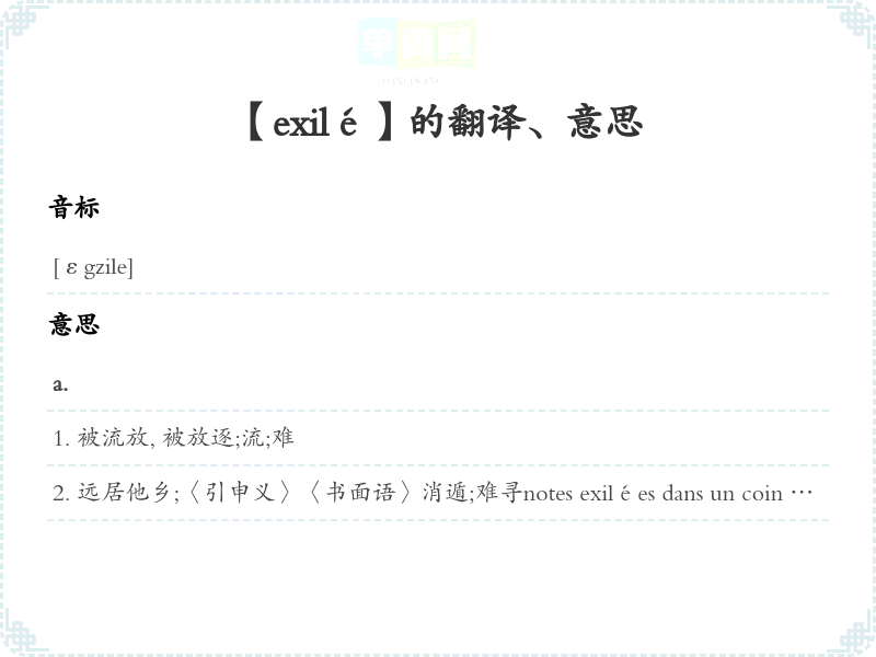 远居他乡;〈引申义〉〈书面语〉消遁;难寻notes exilées dans un coin de journal远逐到报纸一角注释— n.流放者, 放逐者;流者;难者pays qui accueille des exilés politiques政治难者接受国
