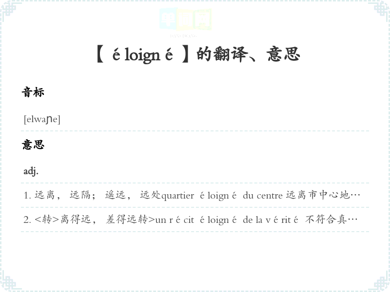 远离, 远隔; 遥远, 远处quartier éloigné du centre 远离市中心地区époque éloignée 遥远时代dans un avenir éloigné 在遥远将来un parent éloigné 一位远亲