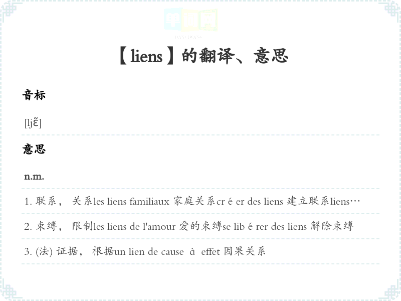 【liens】 助记:、 词根:、 联想、 名词化:、 词化:、 形容词化:、 近义词、 反义词、 同音、近音词 联想词