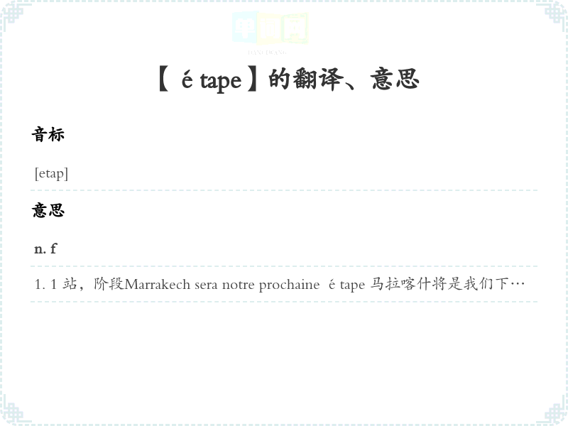 1 站,阶段Marrakech sera notre prochaine étape 马拉喀什将是我们下一站Les étapes de la vie 人生的阶段2 旅站, 休息处, 歇脚处, 宿营地; (长途自行车赛的)中途站