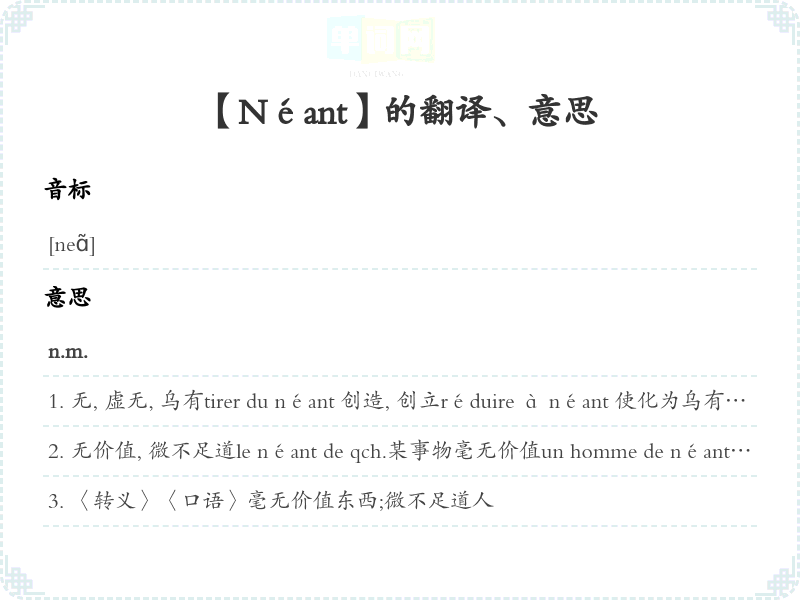 【Néant】 派生:、 近义词:、 反义词: 联想词