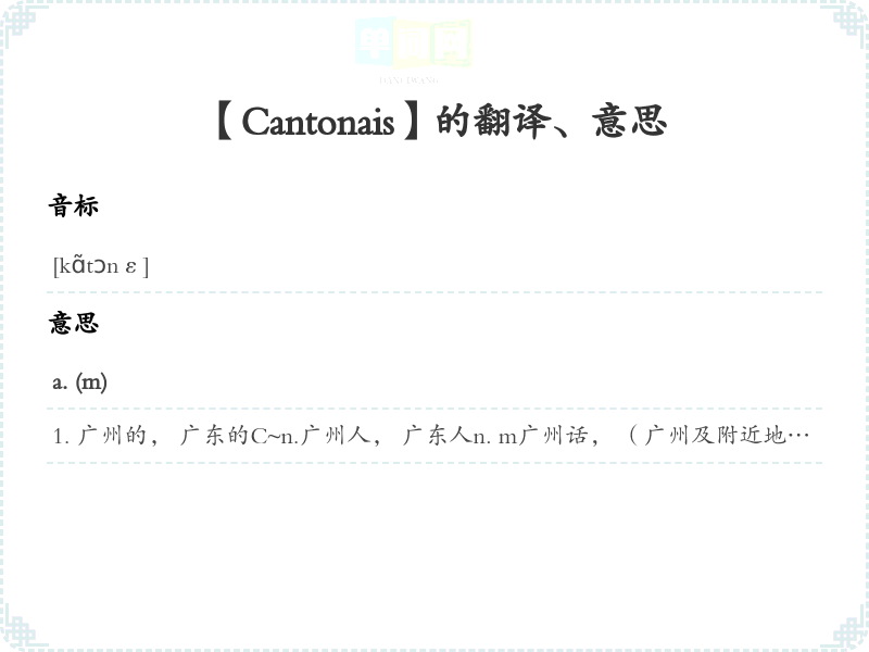 广州的, 广东的C~n.广州人, 广东人n. m广州话, (广州及附近地区使用的语言 )