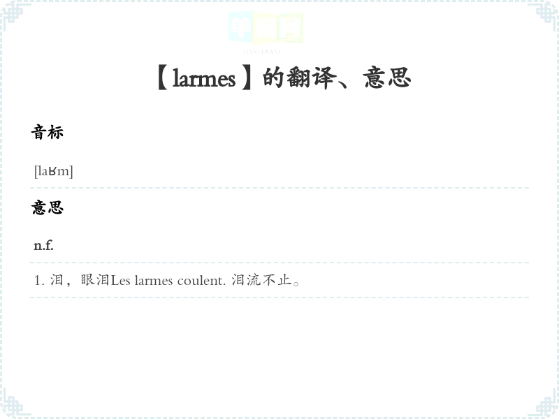 【larmes】 助记:、 词根:、 联想、 名词化:、 词化:、 形容词化:、 近义词、 反义词、 同音、近音词 联想词