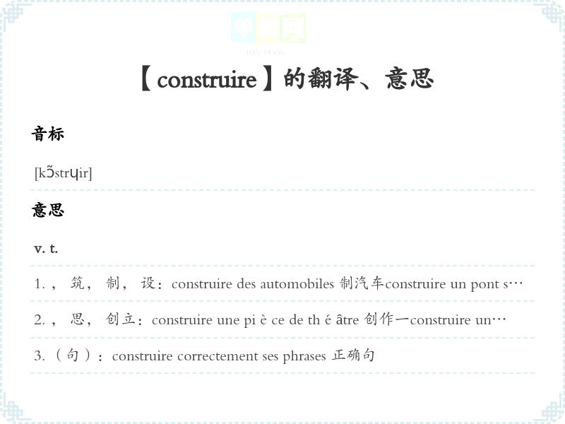 【construire】 助记:、 词根:、 派生:、 联想:、 名词变化:、 形容词变化:、 近义词:、 反义词: 联想词