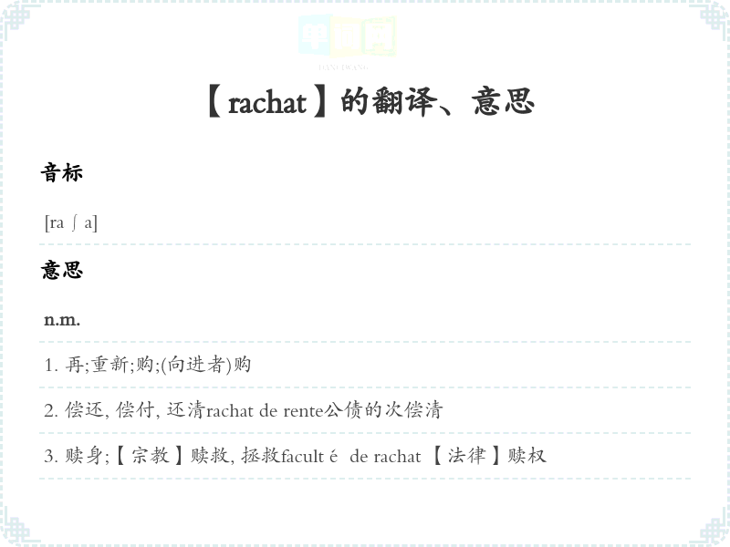 赎身;【宗教】赎救, 拯救faculté de rachat 【法律】赎权