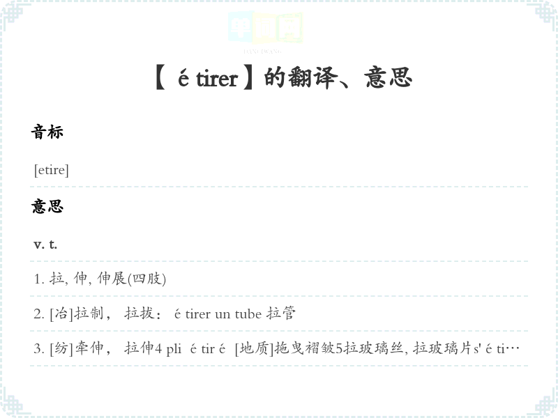 [纺]牵伸, 拉伸4 pli étiré [地质]拖曳褶皱5拉玻璃丝, 拉玻璃片s'étirer v. pr.