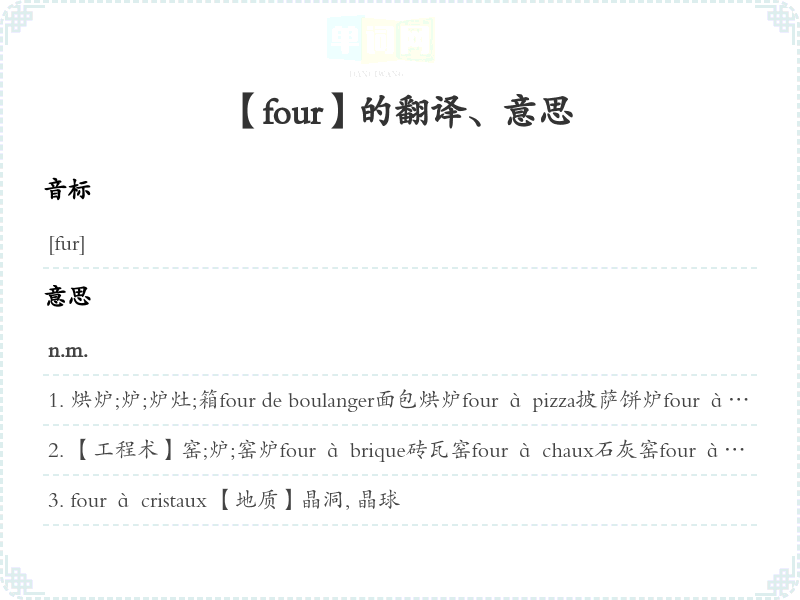 烘炉;炉;炉灶;箱four de boulanger面包烘炉four à pizza披萨饼炉four à micro-ondes微波炉four muni d'un tournebroche有转动铁扦的炉four à gaz煤气灶four électrique电炉four à pyrolyse自洁式炉bouche [gueule] d'un four 炉口, 灶口mettre un gâteau au four 把蛋糕炉ouvrir la bouche comme un four , 〈引申〉 ouvrir un grand four 张开大口On ne peut être à la fois au four et au moulin.〈谚语〉一个人不能同时做两件事。一个人不能同时在两处地方。faire un four 〈转〉失败, 受挫, 不成功 [多指演出或作品]La représentation a été un four complet [noir].〈引申〉演出完全失败了。pièce de four 糕点petits fours小蛋糕, 花式糕点rôti cuit au four 在烘炉里的肉