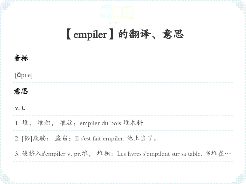 使挤入s'empiler v. pr.堆, 堆积:Les livres s'empilent sur sa table. 书堆在他的桌子上。