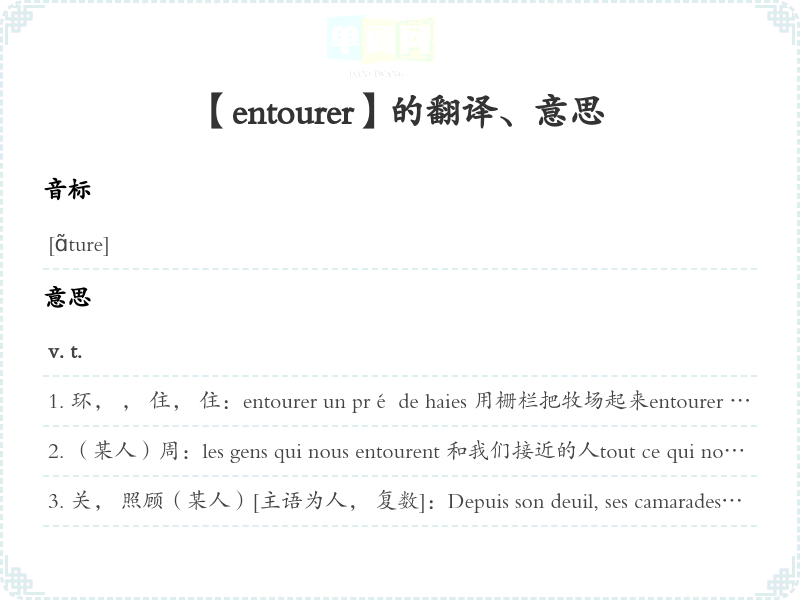 关, 照顾(某人)[主语为人, 复数]:Depuis son deuil, ses camarades l'entourent beaucoup. 自从他失去亲人以后, 同志们都非常关他。Ses enfants l'entourent beaucoup depuis la mort de son mari. 自从她丈夫去世以后,她的孩子们非常关她。s'entourer v. pr. (+ de)
