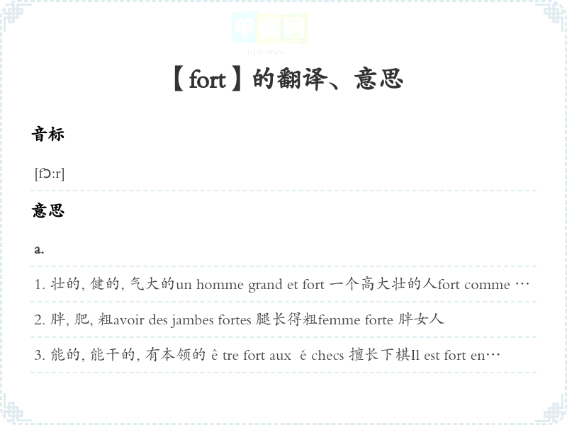 能的, 能干的, 有本领的être fort aux échecs 擅长下棋Il est fort en français. 他法语棒。C'est une tête forte. 这是一个能的人。Il est toujours très fort pour parler.〈戏谑语〉他一向善于辞令。[用作 n.]C'est un fort en gueule. 这是个嘴巴厉害的人。Il n'est pas très fort! 他没有什么了不起!