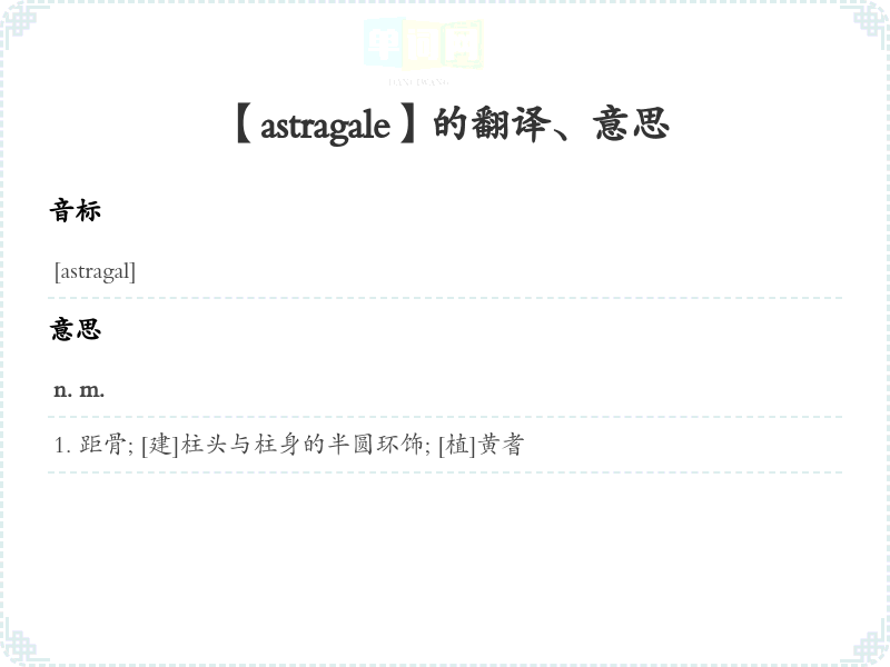 距骨; [建]柱头与柱身的半圆环饰; [植]黄耆