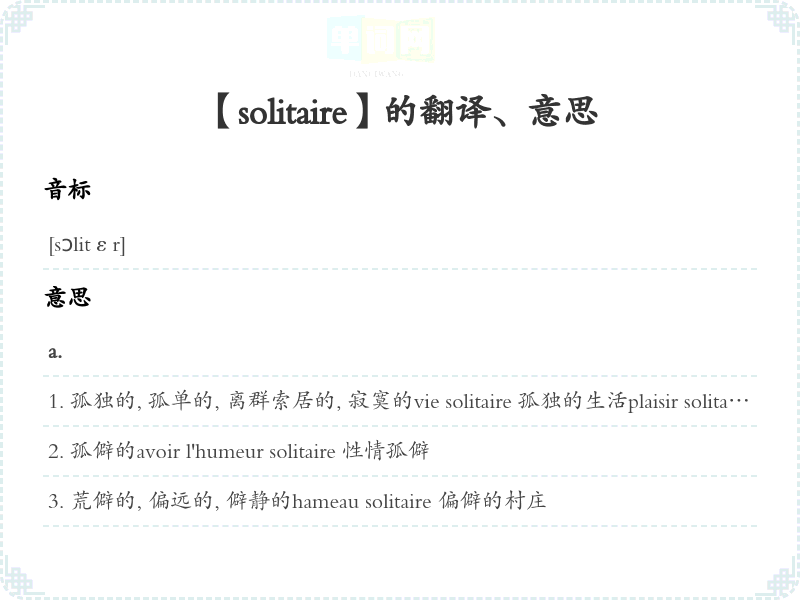 【solitaire】 近义词:、 反义词: 联想词