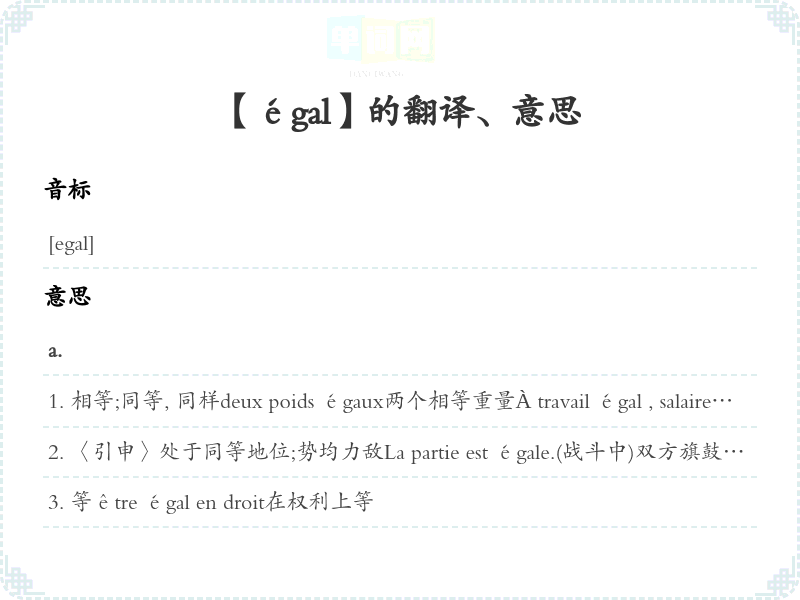 【égal】 名词变化:、 动词变化:、 形容词变化:、 近词:、 反词: 联想词