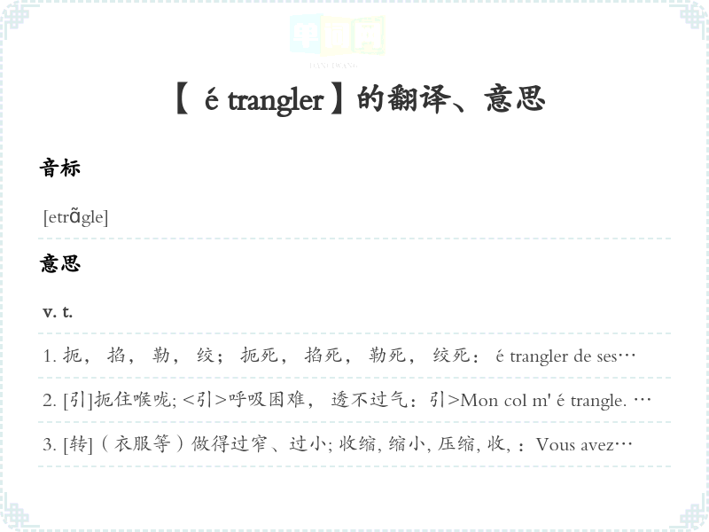 [转]阻止, 抑制; 破产, 破坏, 毁坏:étrangler un procès 草草了结一件诉讼étrangler la presse 禁止有出版自由