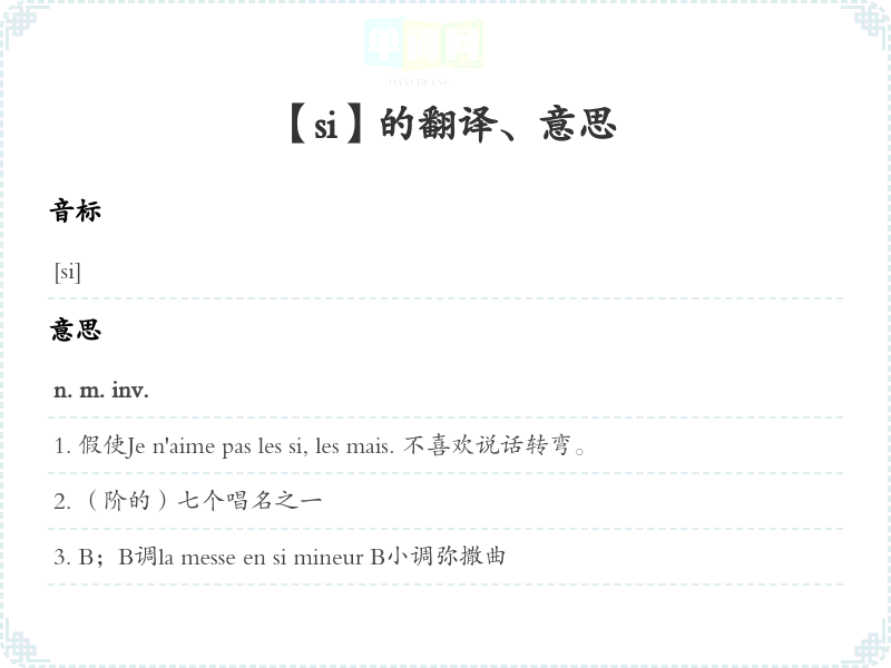 Si [化]元素硅(silicium)的符号conj.[在il,ils前省略s']A [在表示假设的从句中] 如果,假使,只