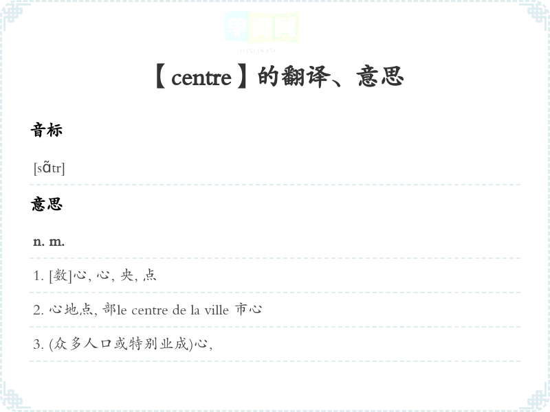【centre】 词源:、 词根:、 近义词:、 反义词: 联想词