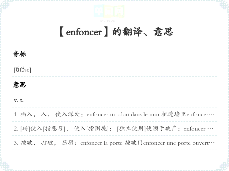 【enfoncer】 派生:、 联想:、 近义词:、 反义词: 联想词