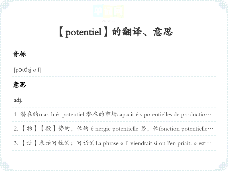 【potentiel】 近义词:、 反义词: 联想词