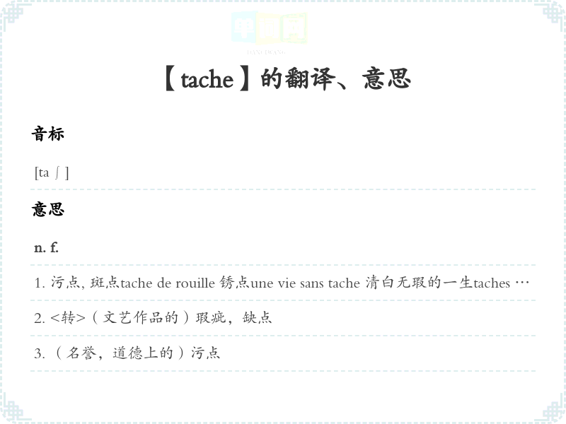 污点, 斑点tache de rouille 锈点une vie sans tache 清白无瑕的一生taches de rousseur 雀斑tache de vin 血管痣