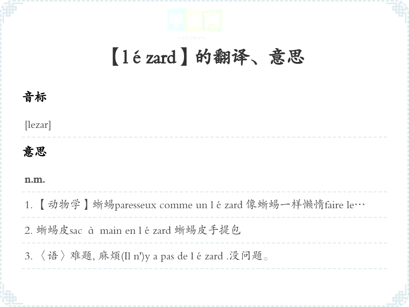 【动物学】蜥蜴paresseux comme un lézard 像蜥蜴一样懒惰faire le lézard 〈〉〈语〉懒洋洋地晒太阳