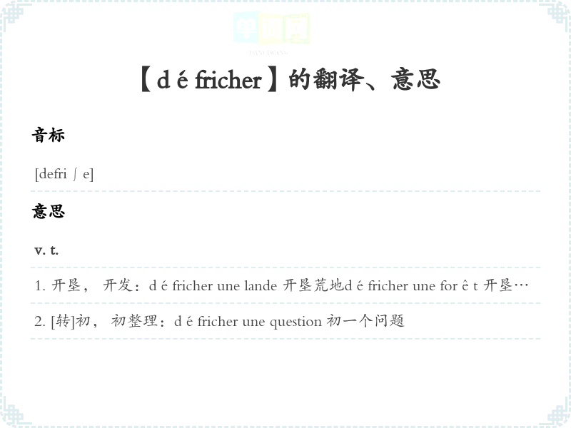 开垦, 开发:défricher une lande 开垦荒地défricher une forêt 开垦林地