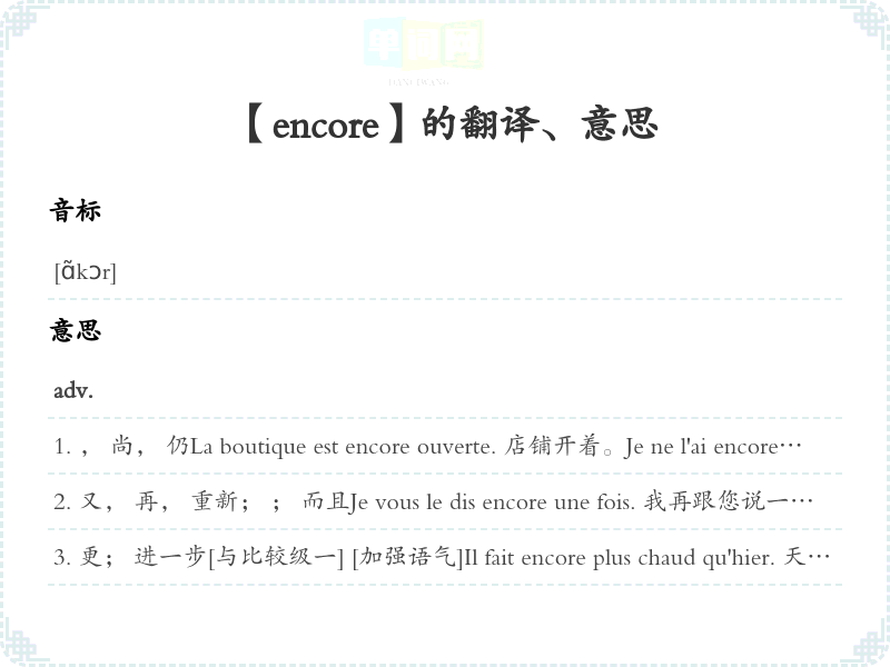 【encore】 助记:、 近义词:、 反义词: 联想词