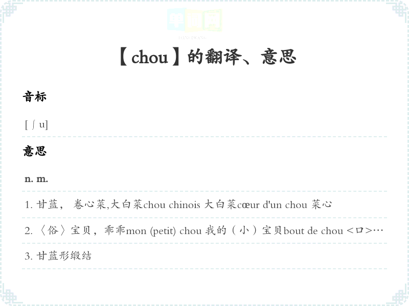 pâte à chou(加水或牛奶调和而成的)鸡蛋松软面团adj. inv.<口>可爱的, 小巧玲珑的口>Elle est chou, sa robe. 她的裙子好漂亮。interj.去![驱使猎犬搜索的叫声]
