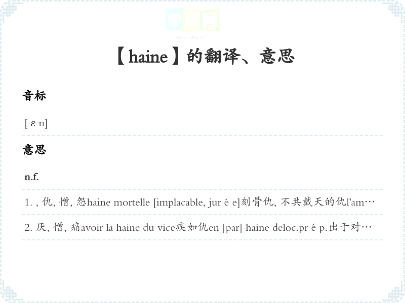 厌, 憎, 痛avoir la haine du vice疾如仇en [par] haine deloc.prép.出于对…的仇organiser la révolte en haine des oppresseurs出于对压迫者的仇而组织反抗