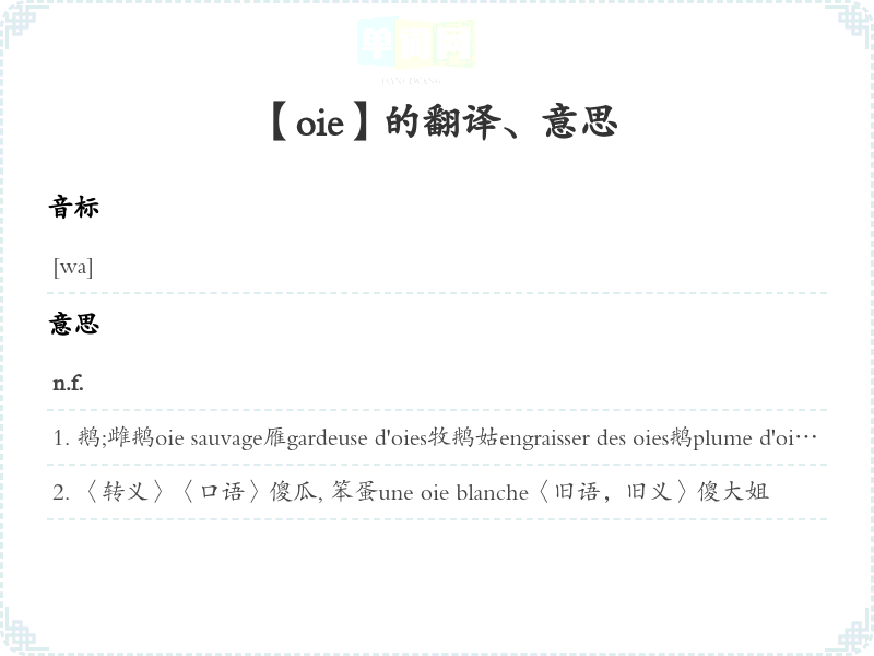 鹅;雌鹅oie sauvage雁gardeuse d'oies牧鹅姑engraisser des oies鹅plume d'oie 鹅毛管;鹅毛笔jeu de l'oie 跳鹅游戏 [一种儿童玩棋]bête comme une oie 蠢极了