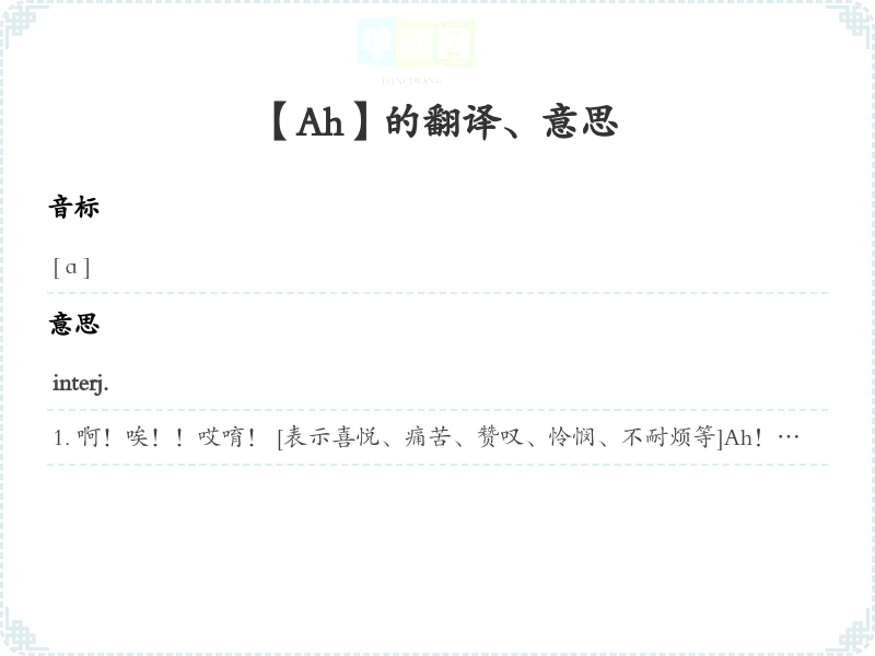 啊!唉!!哎唷! [表示喜悦、痛苦、赞叹、怜悯、不耐烦等]Ah! quel plaisir!啊!真痛快!Ah! vous me faites mal!哎唷!您弄痛我了!Ah! que c'est beau!啊!多美啊!Ah! que je vous plains!唉!您真可怜!Ah! que vous êtes lent!!您怎么这!Ah! que me dites-vous?!您说什么?Ah! c'est vous!啊!原来是您!Ah ah! je vous y prends!哈哈!这下您可给我逮住了!— n.m.inv.pousser des 《oh!》 et des 《ah!》 大发感叹, 赞叹不已
