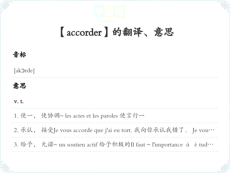【accorder】 派生:、 联想:、 名词变化:、 形容词变化:、 近词:、 反词: 联想词