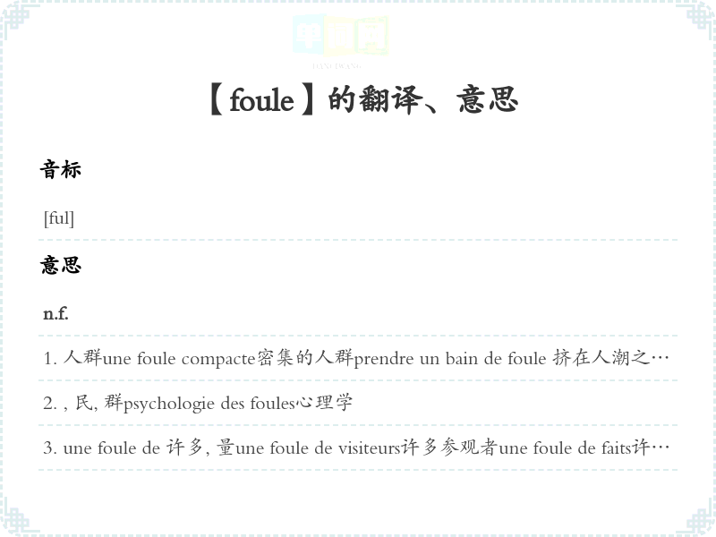 【foule】 联想:、 动词变化:、 近义词:、 反义词: 联想词