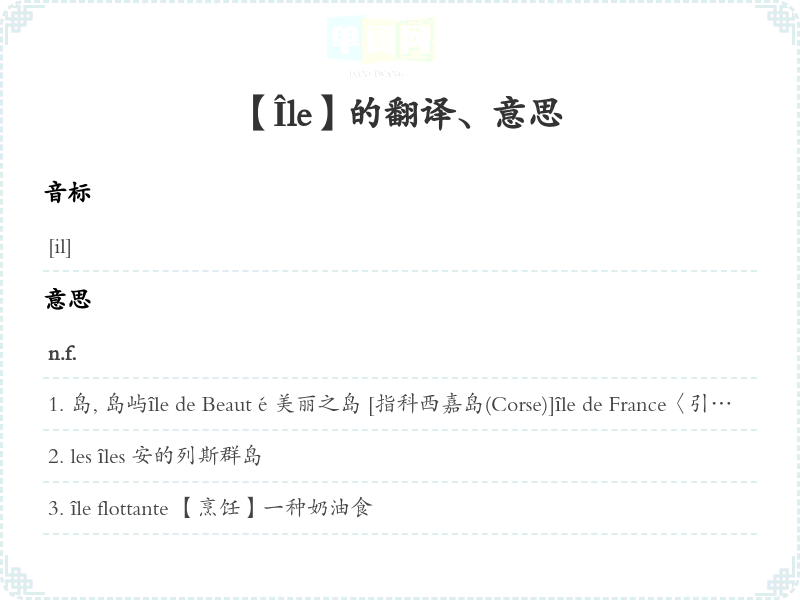 岛, 岛屿île de Beauté美丽之岛 [指科西嘉岛(Corse)]île de France〈引申义〉 法兰西岛 [指Seine、 Oise、 Marne 河及其支流所围成地区, 是法国历史上第一个政治中心]